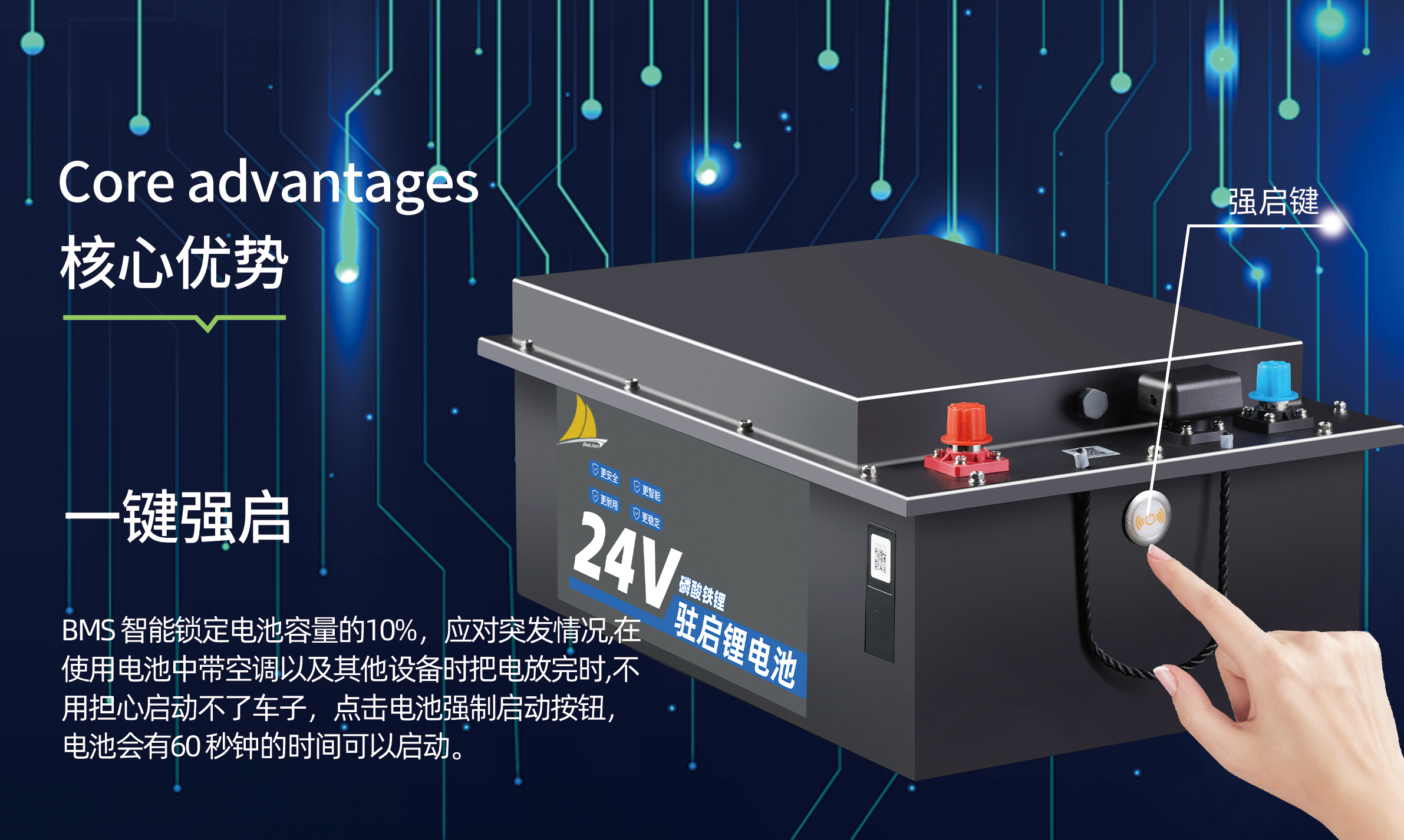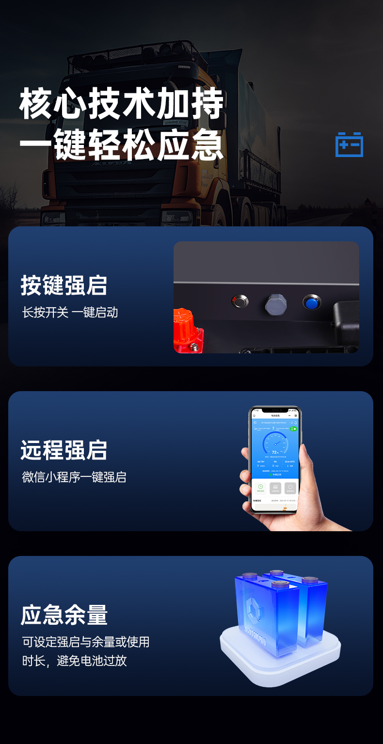 BMS 智能锁定电池容量的10%,应对突发情况,在使用电池中带空调以及其他设备时把电放完时,不用担心启动不了车子,点击电池强制启动按钮电池会有60 秒钟的时间可以启动。